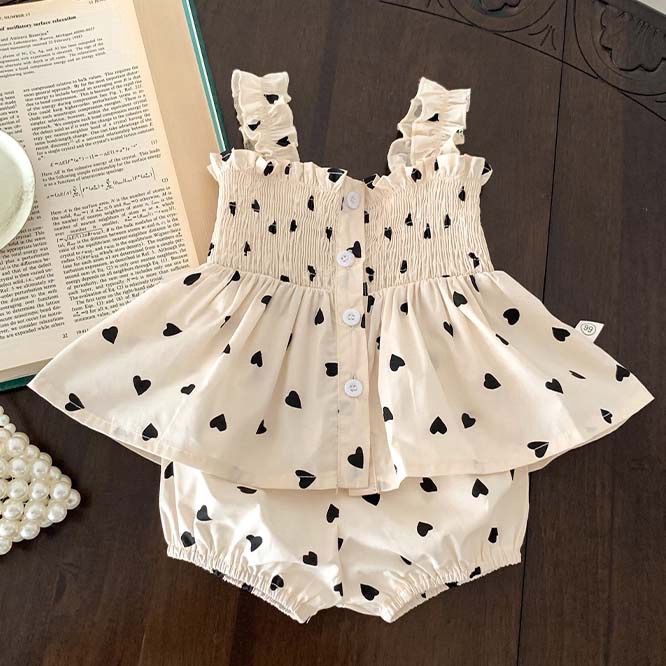 韓国 海外 輸入 キッズ 子供服 ベビー服 赤ちゃん ベージュ ハート ドット柄 水玉 セットアップ 2点セット 上下セット ブルマ パンツ付き おむつカバー お出掛け ノースリーブ キャミソール タンクトップ シャーリング 半袖 70cm 80cm 90cm