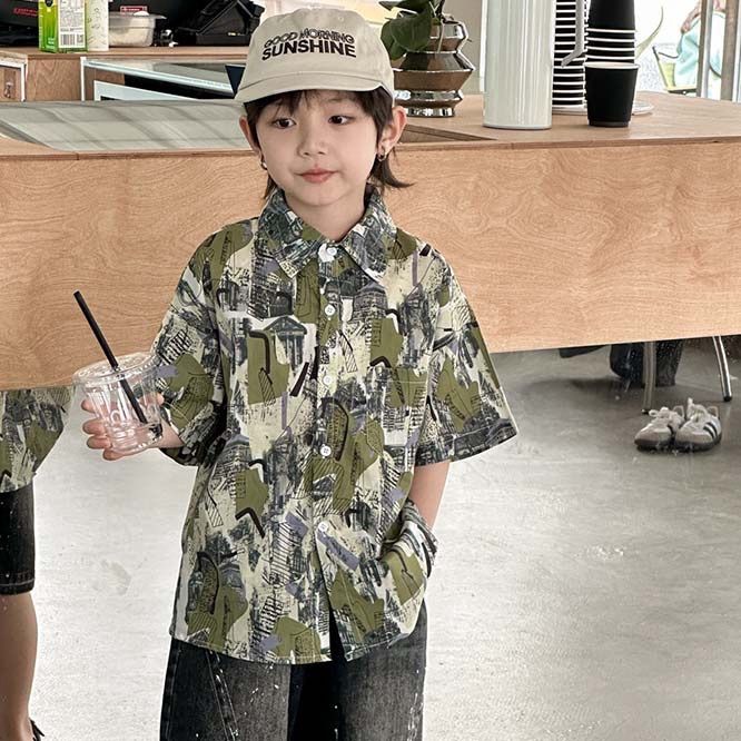韓国 海外 輸入 子供服 キッズ 男の子 男子 おしゃれ 柄シャツ 緑 グリーン 幾何学 アロハシャツ タイダイ トップス 半袖 シャツ 130cm 140cm150cm